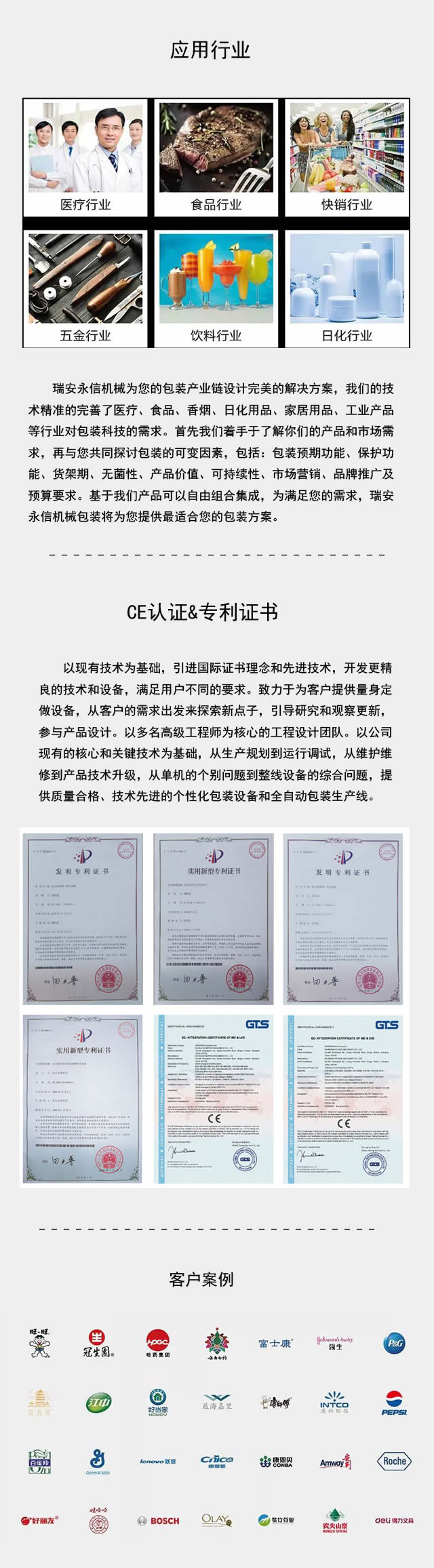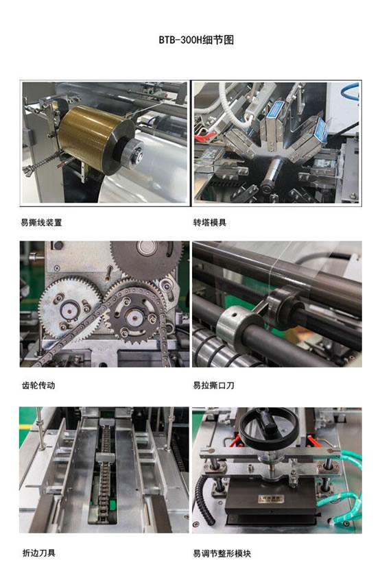 本機(jī)適用于各行業(yè)中的單件盒式物品的薄膜自動包裝(帶金拉線)。本機(jī)整體機(jī)架采用碳鋼噴塑、落地多開安全門結(jié)構(gòu),采用平推式推盒結(jié)構(gòu),更換模具簡單,調(diào)節(jié)距離多處采用手搖式調(diào)節(jié)尺寸,大大節(jié)省換模具時(shí)間,固定膜處采用氣漲軸輥固定,使換膜更簡單、快速。